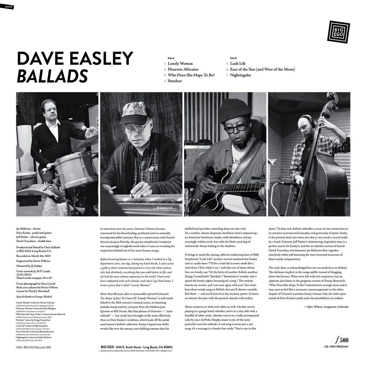 I loved Byways of the Moon, pedal steel virtuoso Dave Easley’s previous record for Big Ego — so when the mensch Chris “Psychic Temple” Schlarb asked me to write the liners for Easley’s Ballads LP, I said yes immediately. What an honor, ladies and gentlemen.